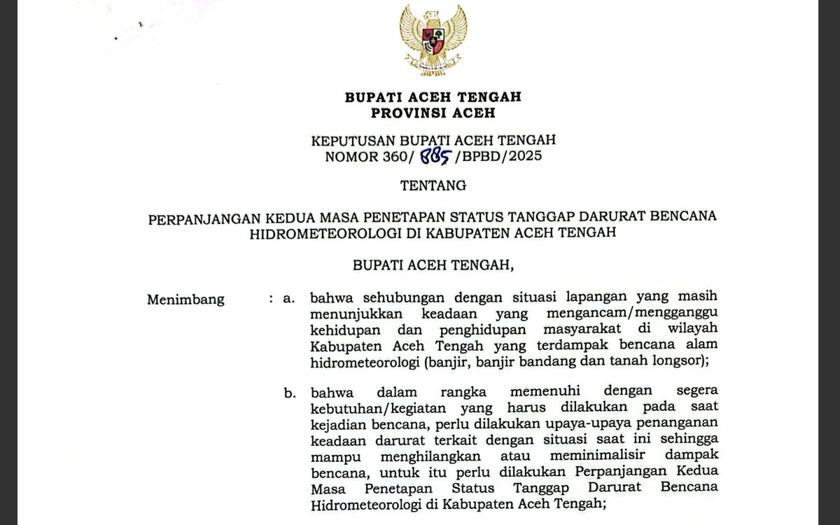 Headline.co.id, Jakarta ~ Pemerintah Kabupaten Aceh Tengah telah memutuskan untuk memperpanjang status Tanggap Darurat Bencana Hidrometeorologi hingga 22 Desember 2025. Keputusan ini diambil melalui Surat Keputusan Bupati Aceh Tengah Haili Yoga, yang merupakan perpanjangan kedua dari status darurat tersebut. Keputusan ini tertuang dalam Keputusan Bupati Aceh Tengah Nomor 360/885/BPBD/2025 dan mulai berlaku sejak 15 Desember 2025.