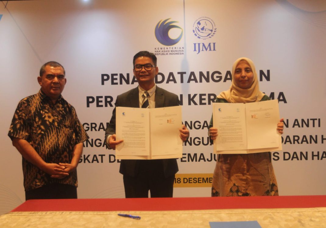 Perjanjian tersebut ditandatangani oleh Try Harysantoso, Direktur Eksekutif Yayasan IJMI, dan Dr. Harniati, Plt. Direktur Jenderal Instrumen dan Penguatan Hak Asasi Manusia. Kerja sama ini meliputi pengembangan kebijakan anti perdagangan orang, peningkatan kesadaran HAM di tingkat desa, serta pemajuan bisnis dan HAM. Dari pihak KemenHAM, penandatanganan disaksikan oleh Sofia Alatas, Direktur Penyusunan dan Evaluasi Instrumen Hak Asasi Manusia, dan Martinus Gabriel Goa, Tenaga Ahli Kementerian Hak Asasi Manusia Bidang Instrumen Internasional HAM.