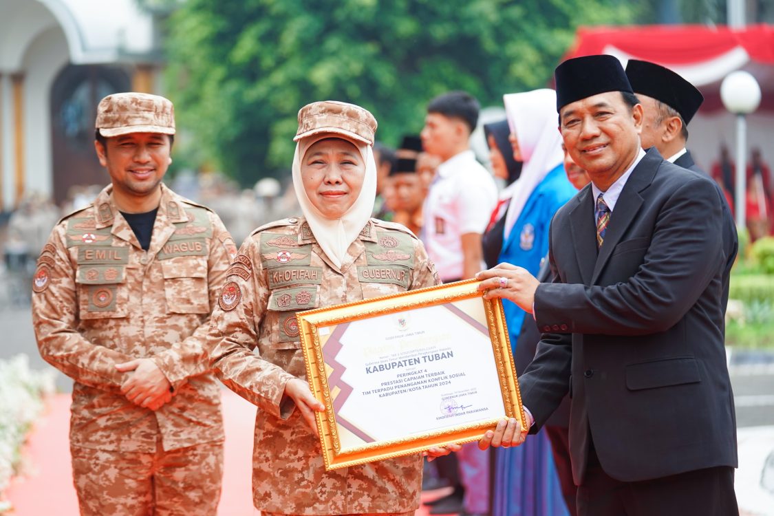 Headline.co.id, Tuban ~ Kabupaten Tuban berhasil meraih prestasi di tingkat provinsi dengan masuk dalam empat besar penanganan konflik sosial terbaik di Jawa Timur pada tahun 2024. Prestasi ini dicapai melalui kinerja Tim Terpadu Penanganan Konflik Sosial Kabupaten Tuban. Penghargaan tersebut diberikan oleh Gubernur Jawa Timur, Khofifah Indar Parawansa, sebagai pengakuan atas laporan rencana aksi terpadu yang dinilai komprehensif, responsif, dan berkelanjutan.