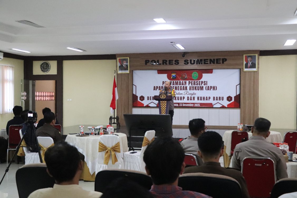 Headline.co.id, Sumenep ~ Kepolisian Resor Sumenep mengadakan kegiatan untuk menyamakan persepsi di Aparat Penegak Hukum (APH) dalam rangka menyambut pemberlakuan Kitab Undang-Undang Hukum Pidana (KUHP) dan Kitab Undang-Undang Hukum Acara Pidana (KUHAP) yang baru. Acara ini berlangsung di Aula Sanika Satyawada Polres Sumenep pada Selasa, 23 Desember 2025.