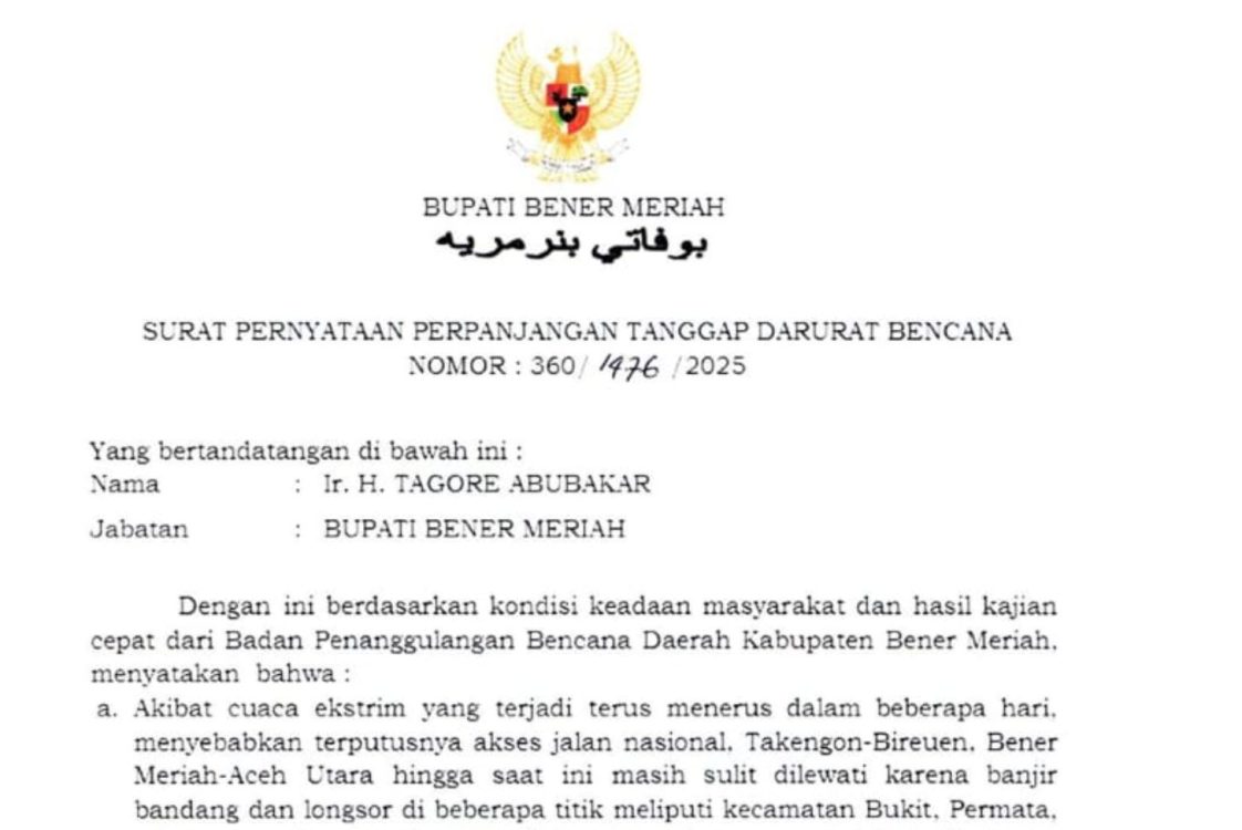 Headline.co.id, Bener Meriah ~ Pemerintah Kabupaten Bener Meriah telah memutuskan untuk memperpanjang Status Tanggap Darurat Bencana mulai 31 Desember 2025 hingga 6 Januari 2026. Keputusan ini diambil melalui Surat Pernyataan Perpanjangan Status Tanggap Darurat Bencana sebagai respons terhadap kondisi lapangan dan kebutuhan penanganan darurat yang masih berlangsung.