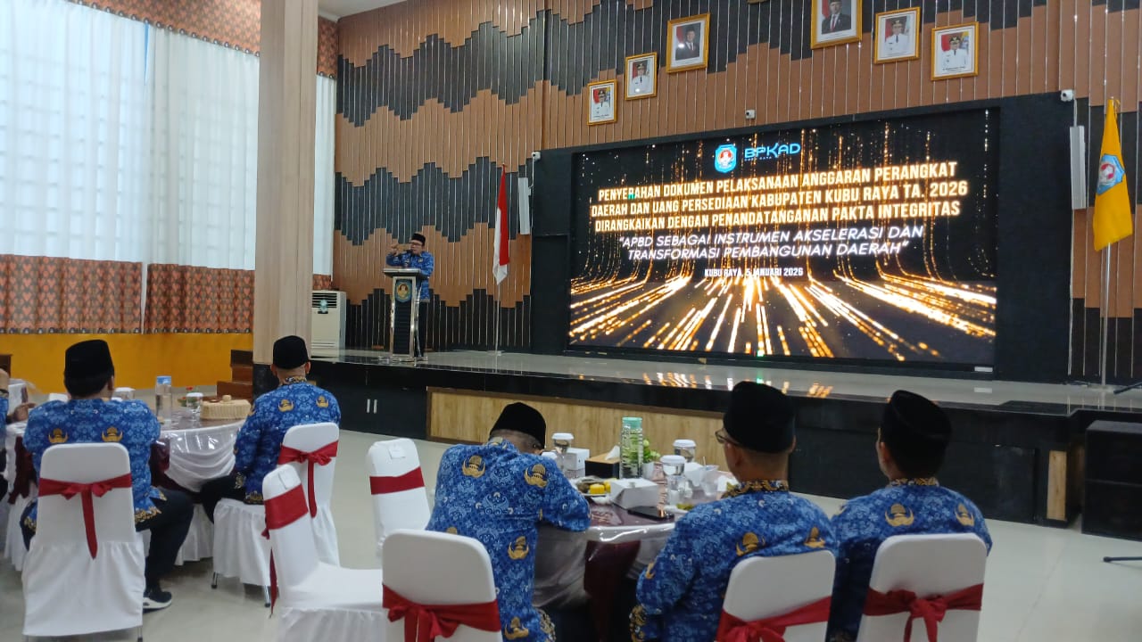 Headline.co.id, Kubu Raya ~ Bupati Kubu Raya, Sujiwo, menekankan pentingnya percepatan eksekusi anggaran daerah untuk memberikan pelayanan nyata kepada masyarakat. Pernyataan ini disampaikan dalam acara penyerahan Dokumen Pelaksanaan Anggaran (DPA) Perangkat Daerah dan Uang Persediaan (UP) Kabupaten Kubu Raya Tahun Anggaran 2026, yang juga diisi dengan penandatanganan pakta integritas di Aula Kantor Bupati Kubu Raya pada Senin (5/1/2026).