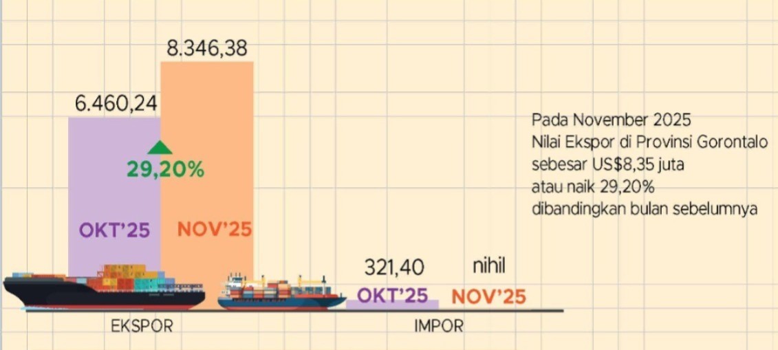 Headline.co.id, Kota Gorontalo ~ Provinsi Gorontalo mencatatkan peningkatan signifikan dalam nilai ekspor pada November 2025. Berdasarkan laporan dari Pelaksana Tugas (Plt.) Kepala Badan Pusat Statistik (BPS) Provinsi Gorontalo, Dwi Alwi Astuti, yang dirilis pada Senin (5/1/2026), nilai ekspor mencapai US$8,35 juta. Angka ini menunjukkan kenaikan sebesar 29,20 persen dibandingkan dengan bulan Oktober 2025 yang tercatat sebesar US$6,46 juta.
