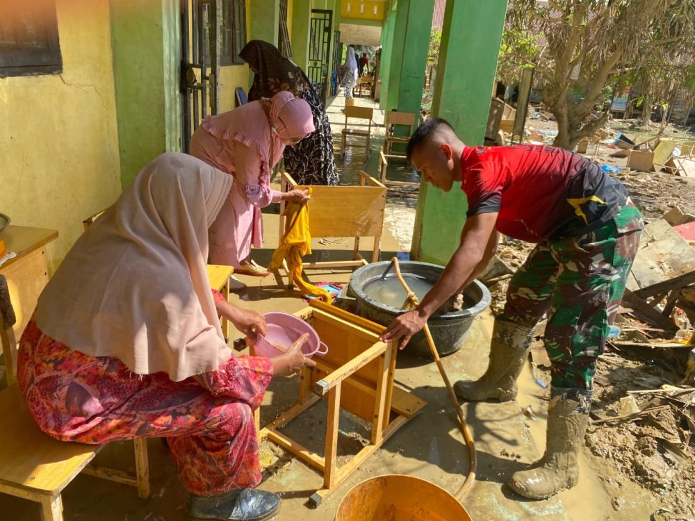 Setelah kegiatan pendampingan psikososial, prajurit melanjutkan tugas membersihkan lumpur sisa banjir di ruang kelas, halaman sekolah, serta fasilitas penunjang lainnya. Langkah ini dilakukan agar kegiatan belajar mengajar dapat kembali berlangsung secara aman, nyaman, dan layak bagi seluruh warga sekolah.