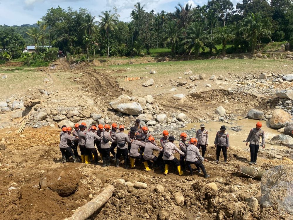 Personel Brimob bergotong royong mengangkut kayu dan material dasar untuk membangun jembatan yang sangat dibutuhkan oleh masyarakat setempat. Jembatan ini merupakan akses utama yang sempat terputus akibat bencana, dan pembangunannya bertujuan untuk memulihkan mobilitas warga, memperlancar distribusi kebutuhan pokok, serta mendukung aktivitas ekonomi dan sosial masyarakat.