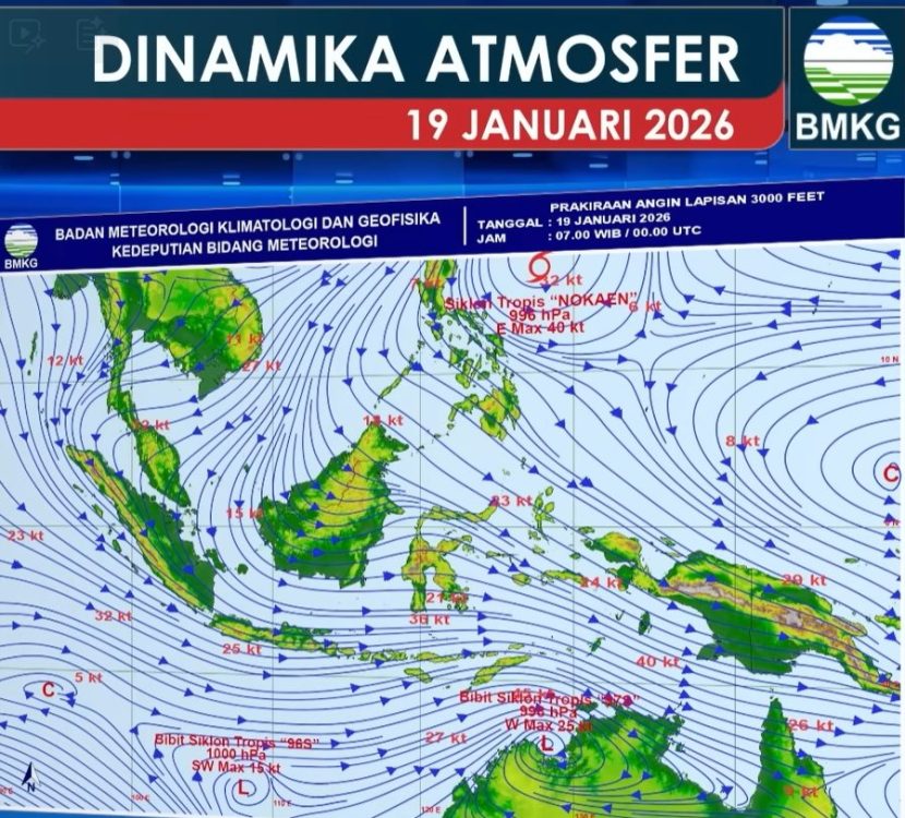 Headline.co.id, Jakarta ~ Badan Meteorologi, Klimatologi, dan Geofisika (BMKG) mengeluarkan peringatan mengenai potensi cuaca ekstrem di sejumlah wilayah Indonesia pada Senin, 19 Januari 2026. Kondisi ini dipicu oleh dinamika atmosfer yang aktif, termasuk pengaruh dari Siklon Tropis Nokaen, beberapa bibit siklon tropis, serta sirkulasi siklonik di sekitar wilayah Indonesia.