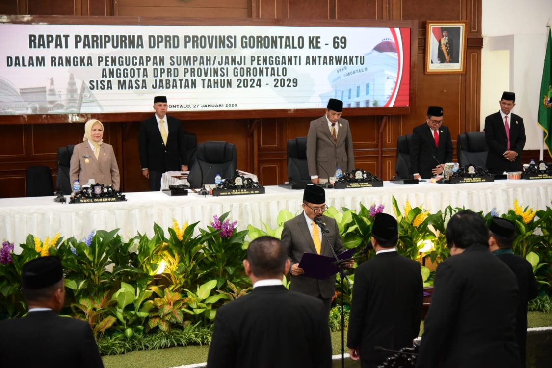 Headline.co.id, Kota Gorontalo ~ Dewan Perwakilan Rakyat Daerah (DPRD) Provinsi Gorontalo telah melaksanakan pelantikan anggota baru melalui mekanisme pergantian antarwaktu (PAW) untuk sisa masa jabatan 2024–2029. Dedy Hamzah resmi diambil sumpah dan janjinya sebagai Anggota PAW DPRD Provinsi Gorontalo dalam rapat paripurna yang digelar pada Senin (26/1/2026). Ia menggantikan posisi yang sebelumnya dipegang oleh Wahyudin Moridu.