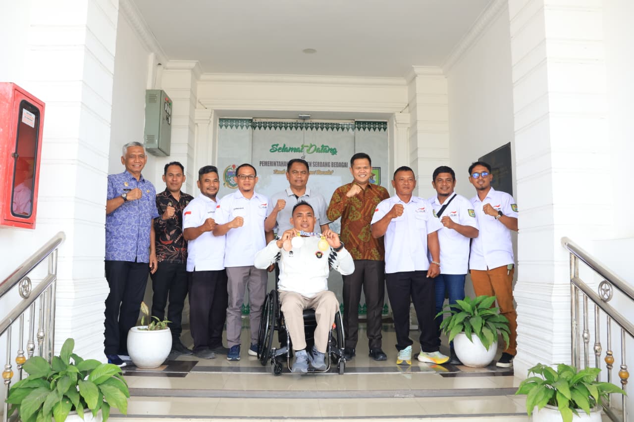 Headline.co.id, Sei Rampah ~ Bupati Serdang Bedagai (Sergai), Darma Wijaya, bersama Wakil Bupati Adlin Tambunan, menyambut kedatangan Riadi Saputra, atlet dari National Paralympic Committee Indonesia (NPCI) Sergai, di Kantor Bupati Serdang Bedagai pada Kamis (29/1/2026). Riadi Saputra berhasil meraih tiga medali pada ajang Asian Para Games (APG) Thailand 2025, yaitu medali emas di nomor lempar cakram Men’s Discus Throw F55, medali perak di nomor lempar lembing Javelin Throw F55, dan medali perunggu di nomor tolak peluru Men’s Shot Put F55.