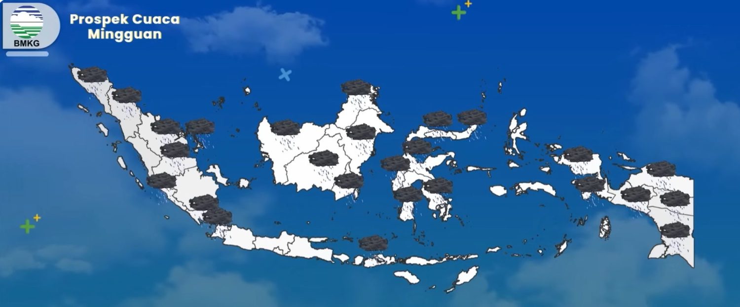 Pada periode 30 Januari hingga 1 Februari 2026, cuaca di Indonesia umumnya didominasi hujan ringan hingga sedang. Namun, potensi hujan sedang hingga lebat perlu diwaspadai di sejumlah wilayah, lain: Aceh, Sumatra Utara, Riau, Kepulauan Riau, Jambi, Bengkulu, Lampung, Banten, Nusa Tenggara Barat, Kalimantan Barat, Kalimantan Tengah, Kalimantan Timur, Kalimantan Utara, Kalimantan Selatan, Sulawesi Utara, Gorontalo, Sulawesi Tengah, Sulawesi Barat, Sulawesi Selatan, Sulawesi Tenggara, Papua Barat Daya, Papua Barat, Papua Tengah, Papua Pegunungan, Papua, dan Papua Selatan.