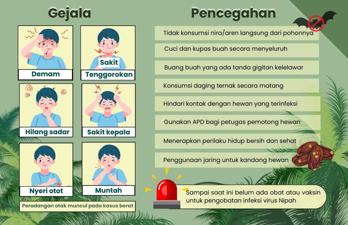 Selain itu, masyarakat dianjurkan untuk mencuci dan mengupas buah sebelum dimakan, serta membuang buah yang menunjukkan bekas gigitan kelelawar. Daging ternak juga harus dimasak hingga matang sempurna untuk mencegah risiko penularan.