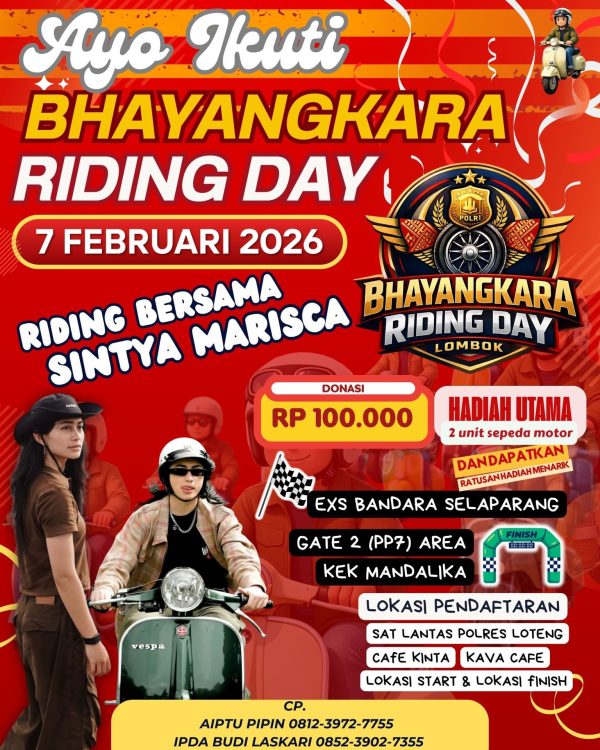 Polres Lombok Tengah mengundang seluruh elemen masyarakat untuk ikut meramaikan dan menyukseskan Bhayangkara Riding Day 2026, sebagai bentuk dukungan terhadap budaya, kemanusiaan, serta pariwisata di Kabupaten Lombok Tengah.