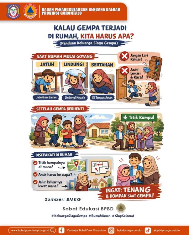Setelah gempa berhenti, Rusli berpesan agar masyarakat keluar dari rumah dengan tenang dan tertib. “Gunakan sandal atau sepatu untuk menghindari pecahan, hindari dorong-dorongan, bantu anak serta lansia, dan arahkan semua menuju titik kumpul keluarga yang telah ditetapkan,” tutupnya. (mcgorontaloprov/ppid)