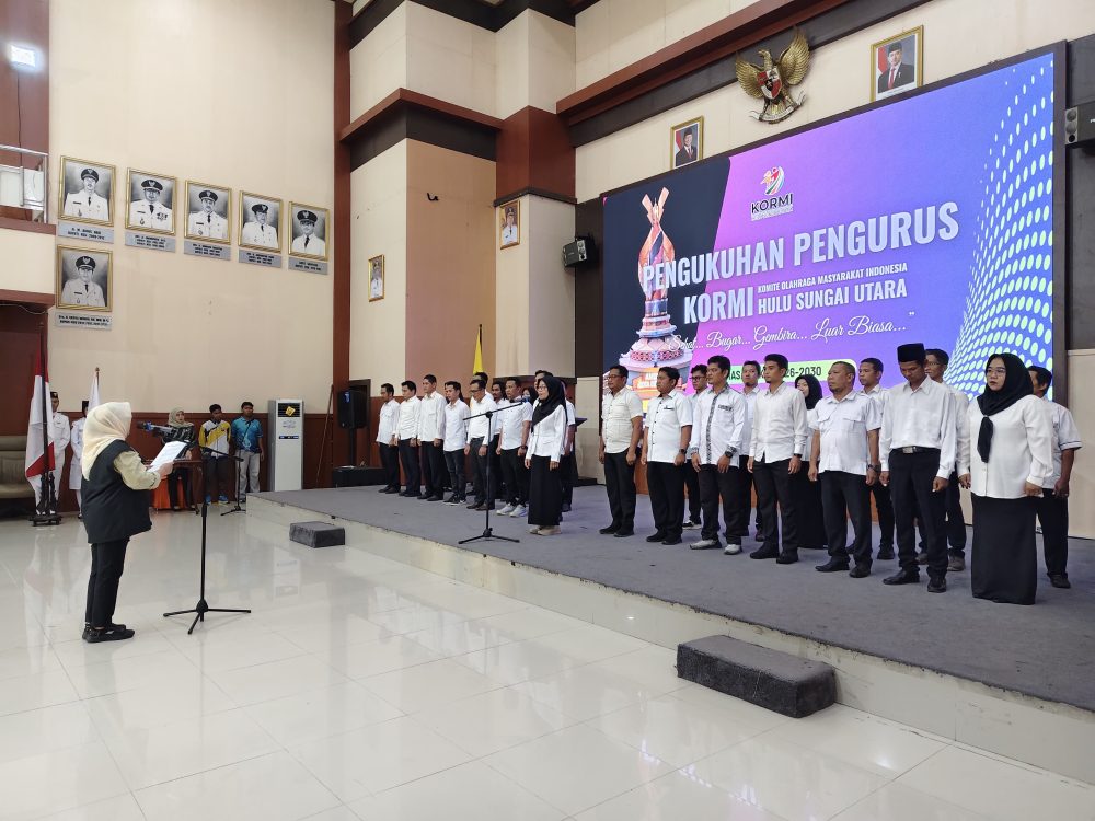 Headline.co.id, Amuntai ~ Sekretaris Komite Olahraga Rekreasi Masyarakat Indonesia (KORMI) Provinsi Kalimantan Selatan, Chairunnisa, secara resmi melantik Ketua KORMI Hulu Sungai Utara (HSU) Aniwarni beserta jajaran pengurus lainnya untuk masa bakti 2026-2030. Acara pelantikan ini berlangsung di Aula Dr KH Idham Chalid pada Kamis, 5 Februari 2026. Pelantikan ditandai dengan pembacaan surat keputusan dan penyerahan bendera pataka KORMI kepada Ketua KORMI HSU yang baru, sebagai simbol amanah dan tanggung jawab dalam mengembangkan olahraga masyarakat di daerah tersebut.