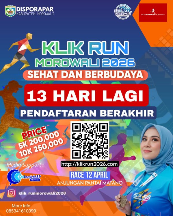 Headline.co.id, Bungku ~ Komunitas Klik Run Morowali kembali menggelar acara tahunan mereka, Klik Run Morowali 2026, yang dijadwalkan berlangsung pada 12 April 2026 di Anjungan Pantai Matano, Morowali. Acara ini merupakan hasil kolaborasi Pemerintah Kabupaten Morowali melalui Dinas Olahraga dan Pariwisata dengan Indorunners Morowali. Mengusung tema “Sehat dan Berbudaya”, kegiatan ini bertujuan untuk memadukan semangat olahraga dengan penguatan identitas kearifan lokal.