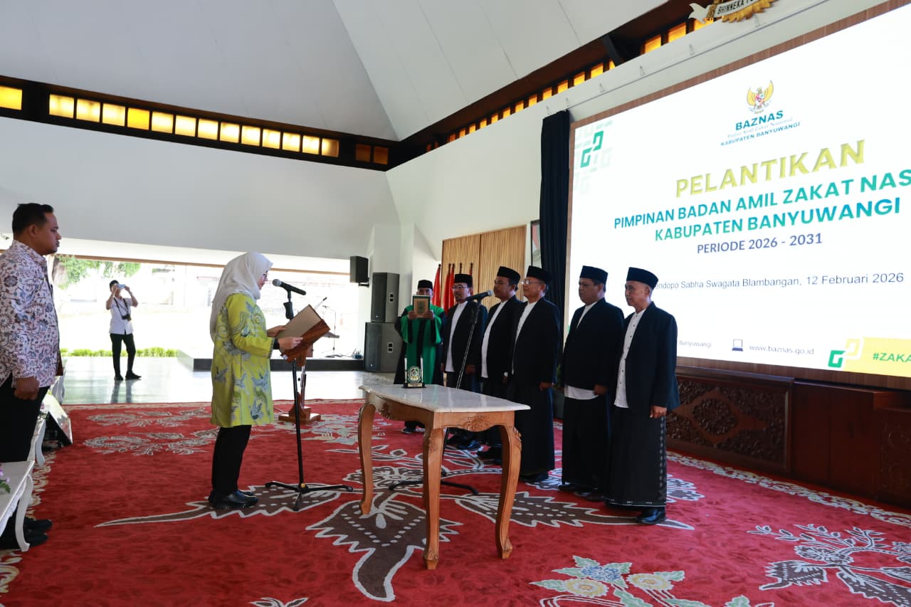 Headline.co.id, Banyuwangi ~ Bupati Banyuwangi, Ipuk Fiestiandani, secara resmi melantik pimpinan baru Badan Amil Zakat Nasional (Baznas) Kabupaten Banyuwangi untuk periode 2026–2031. Acara pelantikan ini berlangsung di Pendopo Sabha Swagata Blambangan pada Kamis (12/2/2026). Dalam kesempatan tersebut, Bupati Ipuk menyampaikan harapannya agar kepemimpinan baru Baznas dapat melanjutkan dan meningkatkan program-program yang telah dicapai oleh kepengurusan sebelumnya.
