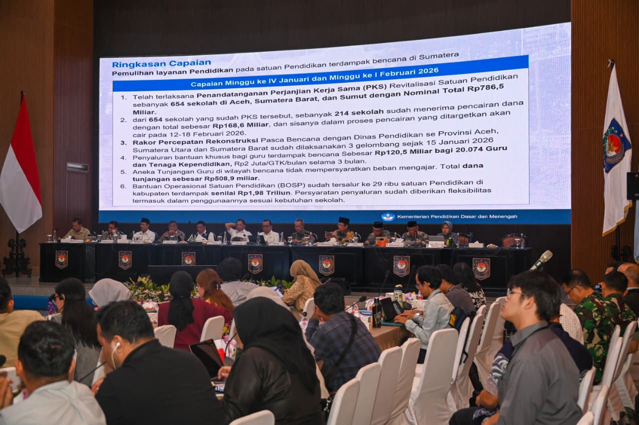 Menteri Pendidikan Dasar dan Menengah, Abdul Mu’ti, menyampaikan komitmen tersebut dalam Rapat Koordinasi Percepatan Rehabilitasi dan Rekonstruksi Pascabencana di Wilayah Sumatra yang digelar di Kementerian Dalam Negeri, Jakarta, Kamis (12/2/2026). “Langkah percepatan ini akan terus berlanjut hingga minggu ketiga Februari 2026. Kami menargetkan penandatanganan PKS revitalisasi untuk total 1.153 sekolah di Aceh, Sumatra Utara, dan Sumatra Barat,” ujar Mendikdasmen.