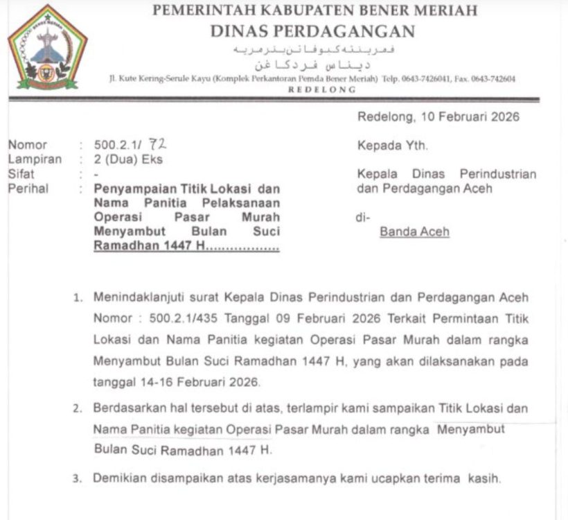 Pelaksana Tugas Kepala Dinas Perdagangan Kabupaten Bener Meriah, Rahmayanti, menyatakan bahwa pelaksanaan Operasi Pasar Murah ini merupakan langkah strategis dari pemerintah daerah untuk mengantisipasi lonjakan harga yang disebabkan oleh meningkatnya permintaan bahan pokok. Rincian mengenai lokasi dan kepanitiaan kegiatan ini telah disampaikan secara resmi kepada Dinas Perindustrian dan Perdagangan Aceh melalui surat nomor 500.2.1/72 sebagai bentuk koordinasi dengan Pemerintah Provinsi Aceh.