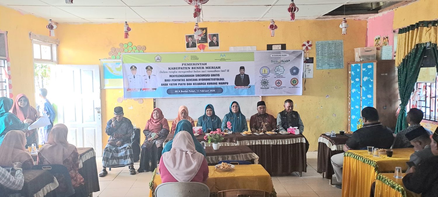 Headline.co.id, Bener Meriah ~ Pemerintah Kabupaten Bener Meriah mengadakan kegiatan sunat massal bagi anak-anak penyintas bencana hidrometeorologi, anak yatim piatu, dan anak-anak dari keluarga kurang mampu. Acara ini berlangsung di SD Negeri Buntul Peteri, Kecamatan Permata, pada Jumat (13/2/2026). Kegiatan ini dibuka secara resmi oleh Asisten Perekonomian dan Pembangunan Setdakab Bener Meriah, Samusi Purnawira Dade. Hadir dalam acara tersebut lain Ketua TP-PKK Kabupaten Bener Meriah, Wakil Ketua TP-PKK, Ketua Dharma Wanita Persatuan Bener Meriah, Kepala DP3AKB Bener Meriah, Ketua MPD Kabupaten Bener Meriah, Camat Permata, unsur Forkopimcam Permata, Ketua TP-PKK Kecamatan Permata, serta aparatur Desa Buntul Peteri.