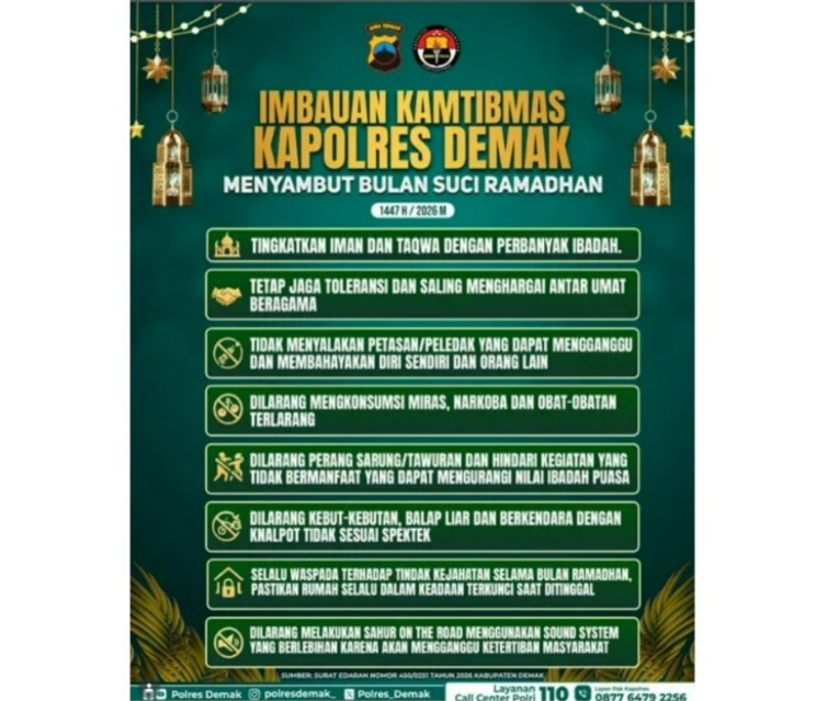 Headline.co.id, Demak ~ Kepala Kepolisian Resor (Kapolres) Demak, AKBP Arizzal Samelino, mengeluarkan imbauan kepada masyarakat Kabupaten Demak menjelang bulan suci Ramadan 1447 Hijriah. Imbauan ini disampaikan melalui akun Instagram resmi Polres Demak @polresdemak pada Jumat, 20 Februari 2026. Dalam pesannya, Kapolres mengajak masyarakat untuk meningkatkan iman dan takwa dengan memperbanyak ibadah serta menjaga kekhusyukan selama menjalankan ibadah puasa.