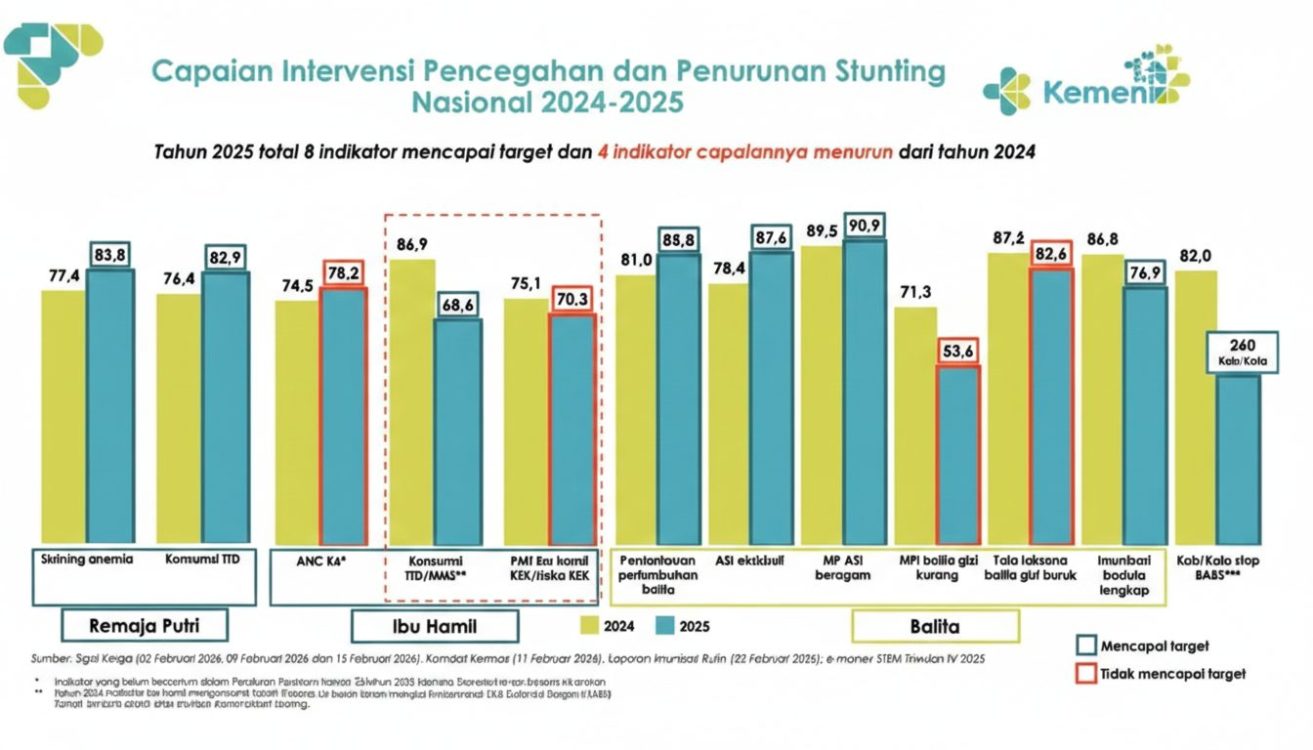 Headline.co.id, Jakarta ~ Program percepatan penurunan stunting di Indonesia menunjukkan kemajuan yang signifikan pada tahun 2025. Kementerian Kesehatan melaporkan bahwa delapan dari sebelas indikator intervensi spesifik telah mencapai target nasional. Meski demikian, masih diperlukan penguatan pada indikator pemberian makanan tambahan (PMT) dan pemeriksaan kehamilan atau antenatal care (ANC) untuk mencapai hasil yang lebih optimal pada tahun 2026.