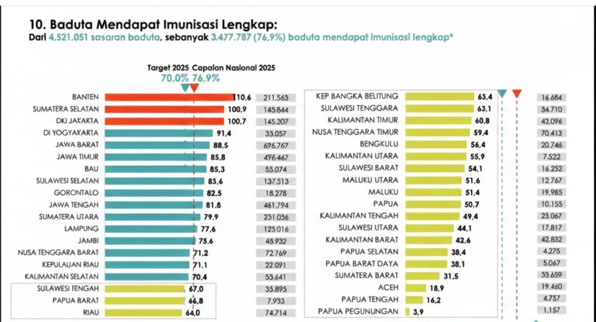 “Target kita adalah memastikan pemerataan, agar setiap anak di setiap wilayah mendapatkan perlindungan lengkap tepat waktu,” pungkas Lovely Daisy. Dengan capaian 76,9 persen pada 2025, pemerintah optimistis target nasional dapat terus dipertahankan sekaligus ditingkatkan melalui strategi pemerataan dan penguatan layanan di wilayah dengan cakupan rendah.