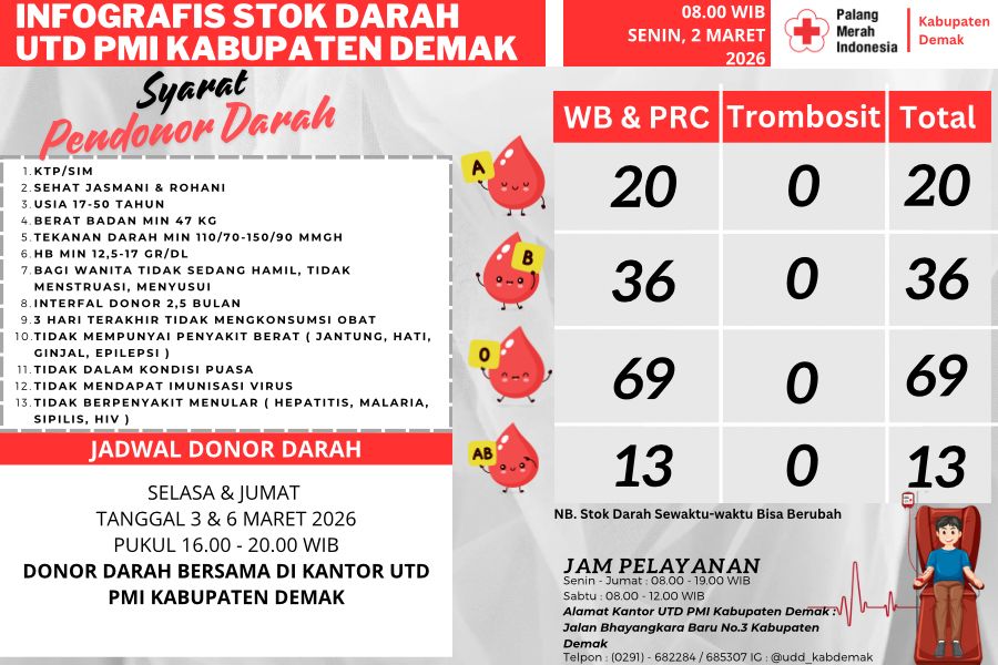 Headline.co.id, Demak ~ Unit Transfusi Darah Palang Merah Indonesia (UTD PMI) Kabupaten Demak melaporkan bahwa stok darah per Senin, 2 Maret 2026, pukul 08.00 WIB masih tersedia untuk beberapa golongan darah, namun stok trombosit saat ini kosong. Informasi ini disampaikan oleh Gustavian Bima, Staf UTD PMI Kabupaten Demak, melalui pesan WhatsApp.