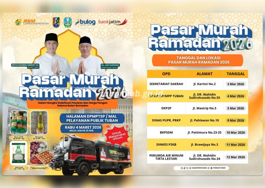 Pelaksanaan pasar murah di lingkungan OPD dijadwalkan mulai 3 Maret 2026 di Sekretariat Daerah, kemudian dilanjutkan di DPMPTSP/Mal Pelayanan Publik, DKP2P, Dinas PUPR PRKP, BKPSDM, Dinas Kesehatan P2KB, hingga Perumda Air Minum Tirta Lestari. Pada Rabu, 4 Maret 2026, pasar murah di halaman Mal Pelayanan Publik Tuban akan diperkuat dengan kehadiran program EPIK Mobile atau Etalase Pengendalian Inflasi Kabupaten/Kota dari Pemerintah Provinsi Jawa Timur.