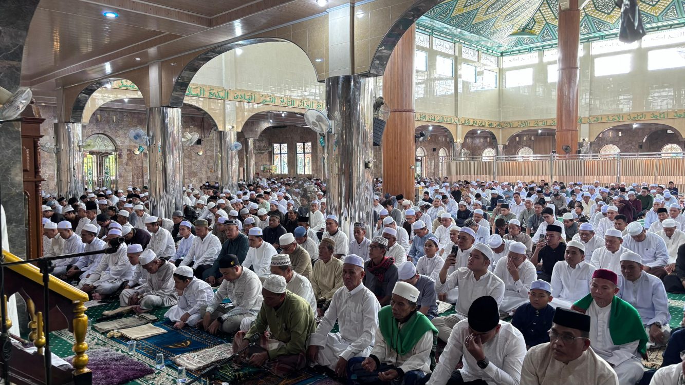 Headline.co.id, Amuntai ~ Bupati Hulu Sungai Utara (HSU), Sahrujani, bersama Wakil Bupati Hero Setiawan dan anggota Forum Koordinasi Pimpinan Daerah (Forkopimda) melaksanakan salat Idulfitri 1447 Hijriah di Masjid Agung At Taqwa, Amuntai, pada Sabtu (21/3/2026). Ibadah tersebut berlangsung dengan khidmat dan dihadiri oleh ratusan jamaah dari berbagai kalangan masyarakat.