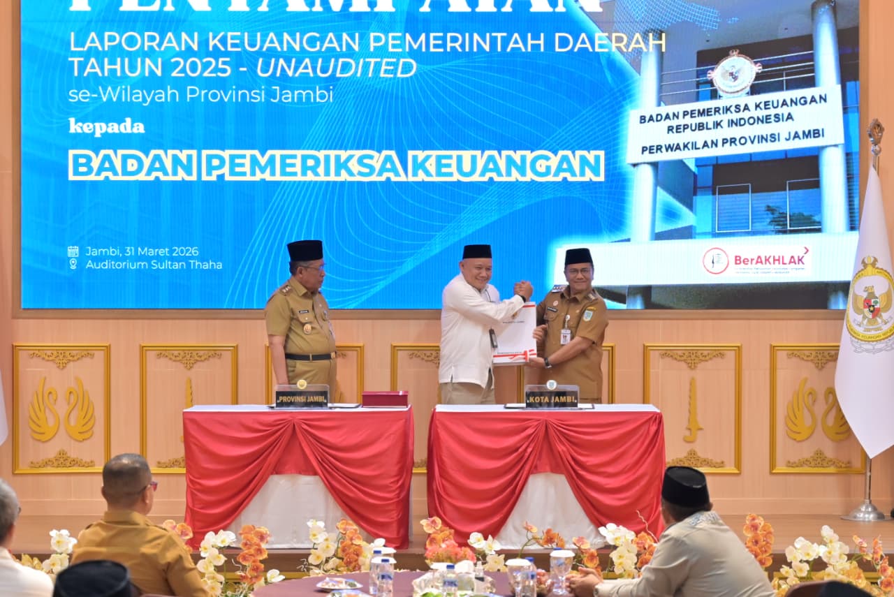 Headline.co.id, Jambi ~ Pemerintah Kota Jambi menunjukkan komitmennya terhadap transparansi dan akuntabilitas keuangan dengan menyerahkan Laporan Keuangan Pemerintah Daerah (LKPD) unaudited Tahun Anggaran 2025 kepada Badan Pemeriksa Keuangan (BPK) RI Perwakilan Provinsi Jambi. Penyerahan ini dilakukan oleh Wali Kota Jambi, Maulana, di Auditorium Sutan Thaha, Kantor BPK RI Perwakilan Provinsi Jambi, pada Selasa (31/3/2026), bersama dengan kepala daerah lainnya di Provinsi Jambi.