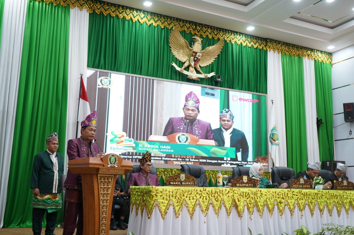 Headline.co.id, Paringin ~ Dalam rapat paripurna peringatan Hari Jadi ke-23 Kabupaten Balangan yang berlangsung di Ruang Paripurna DPRD Balangan, Paringin Selatan, Selasa (7/4/2026), Bupati Balangan, Abdul Hadi, mengajak seluruh pemangku kepentingan untuk terus berpartisipasi aktif dalam pembangunan daerah. Ia menekankan bahwa capaian pembangunan sepanjang tahun 2025 menunjukkan hasil yang positif berkat dukungan dari berbagai pihak. Menurutnya, keberhasilan tersebut menjadi modal penting untuk melanjutkan pembangunan di masa mendatang.