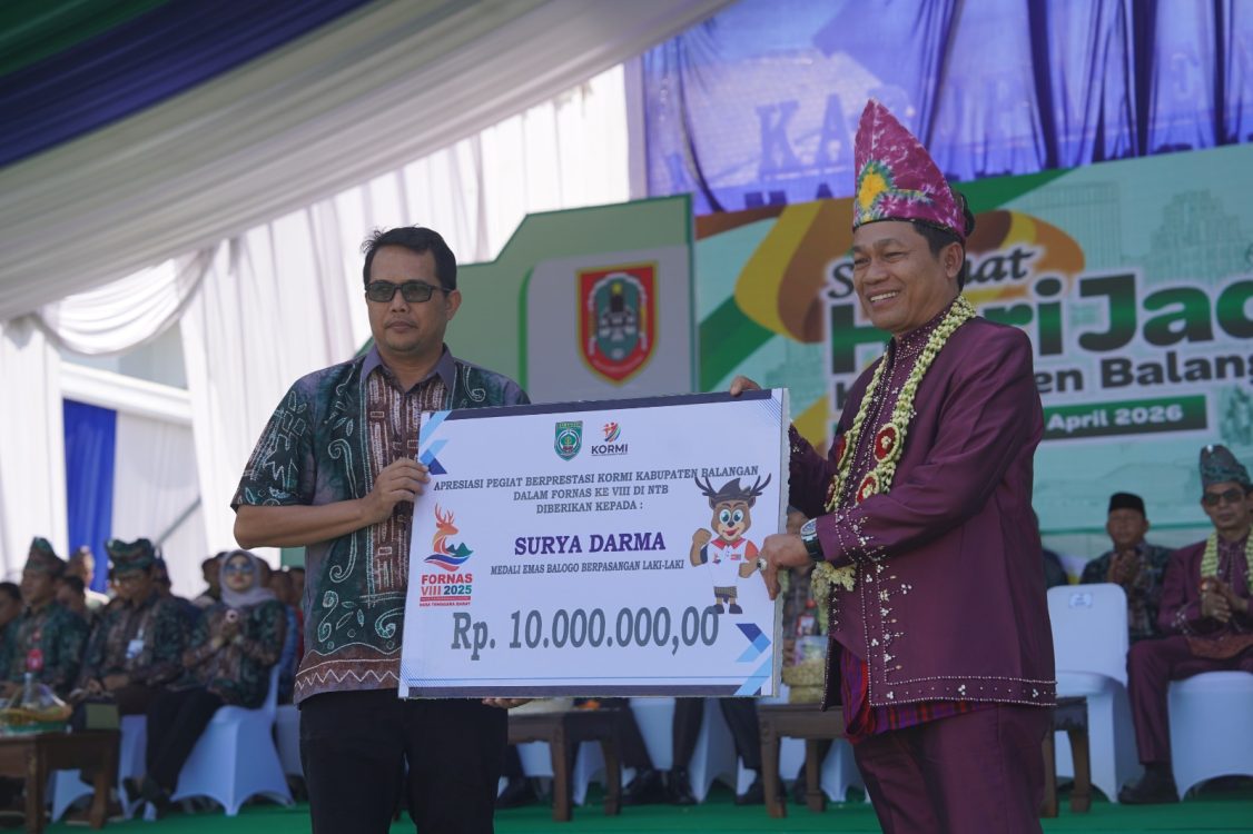 Acara tersebut juga diisi dengan pemutaran video kaleidoskop capaian pembangunan, penyerahan penghargaan kepada pegiat berprestasi di ajang Festival Olahraga Masyarakat Nasional (Fornas) VIII di Nusa Tenggara Barat. Selain itu, diserahkan pula sertifikat hak pakai tanah milik pemerintah daerah secara simbolis oleh Kantor Pertanahan Kabupaten Balangan, dividen tahun buku 2025, serta program CSR tahun 2026 oleh Bank Kalsel. Penyerahan naskah perjanjian hibah dan berita acara serah terima Kantor UPPD Samsat Paringin juga dilakukan dalam kesempatan tersebut. (MC Balangan/Stq/Eyv)