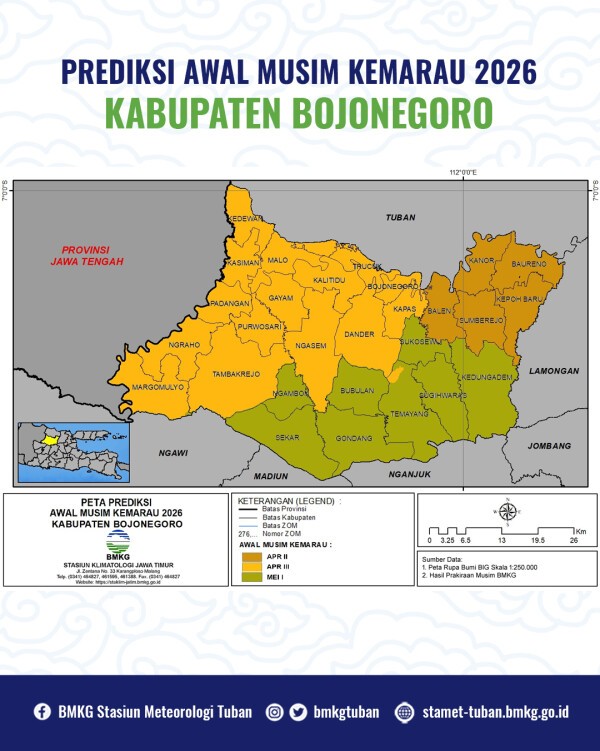 Menurut prediksi BMKG Tuban, awal musim kemarau di Kabupaten Bojonegoro 2026 akan dimulai pada tiga dasarian. Pada April Dasarian II (tanggal 11-20), kemarau akan melanda Kecamatan Balen, Baureno, Kanor, dan Kepohbaru. Selanjutnya, pada April Dasarian III (tanggal 21-30), kemarau akan melanda Kecamatan Bojonegoro, Dander, Gayam, Kalitidu, Kapas, Kasiman, Kedewan, Malo, Margomulyo, Ngasem, Ngraho, Padangan, Purwosari, Tambakrejo, dan Trucuk. Sementara itu, pada Mei Dasarian I (tanggal 1-10), kemarau akan melanda Kecamatan Bubulan, Gondang, Kedungadem, Ngambon, Sekar, Sugihwaras, Sukosewu, dan Temayang.