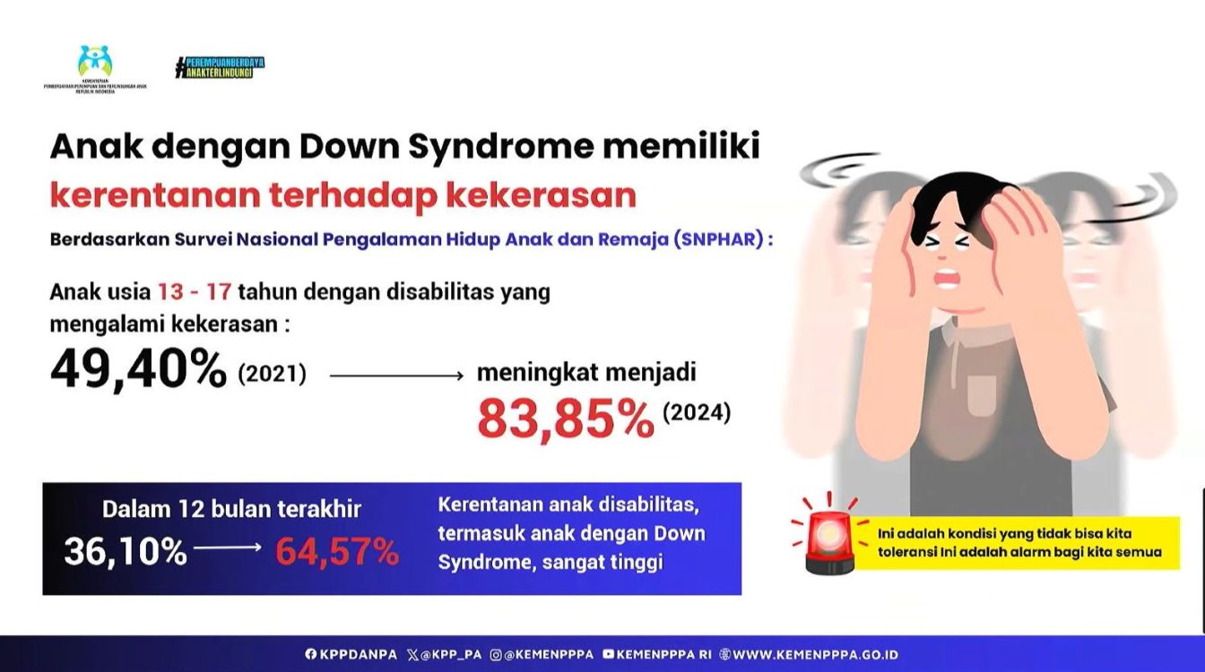 Namun, Menteri PPPA mengungkapkan bahwa anak dengan down syndrome masih sering menghadapi stigma, diskriminasi, serta kekerasan fisik dan psikologis. Berdasarkan data Survei Nasional Pengalaman Hidup Anak dan Remaja (SNPHAR) 2024, sebanyak 83,85 persen anak usia 13–17 tahun penyandang disabilitas mengalami setidaknya satu jenis kekerasan sepanjang hidupnya. Selain itu, angka kekerasan dalam 12 bulan terakhir juga meningkat signifikan, dari 36,10 persen menjadi 64,57 persen. “Artinya lebih dari setengah anak dengan disabilitas masih hidup dalam bayang-bayang kekerasan. Ini adalah kondisi yang tidak bisa kita toleransi,” tegasnya.