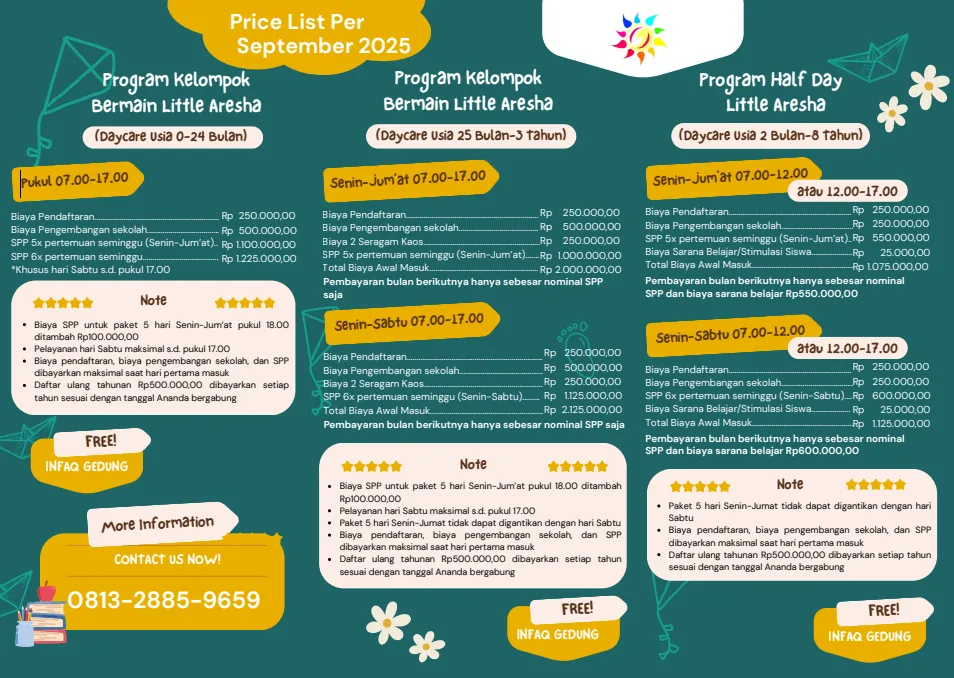 Berdasarkan dokumen pricelist periode September 2025 yang diterima Headline.co.id dari Salah satu orang tua korban, Little Aresha menawarkan beberapa program daycare dan kelompok bermain dengan variasi biaya berbeda.