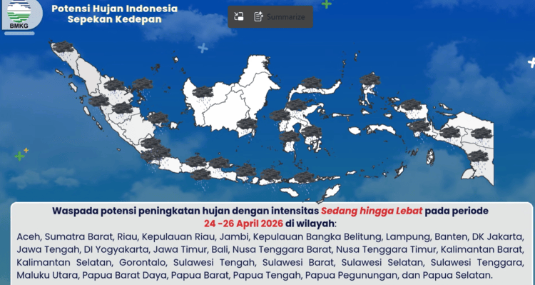 Untuk periode 24–26 April 2026, cuaca di Indonesia diperkirakan didominasi hujan ringan hingga lebat. Peningkatan hujan sedang hingga lebat berpotensi terjadi di Aceh, Sumatra Barat, Riau, Kepulauan Riau, Jambi, Bangka Belitung, Lampung, Banten, DKI Jakarta, Jawa, Bali, Nusa Tenggara, Kalimantan, Sulawesi, Maluku, hingga Papua. BMKG juga mengeluarkan peringatan dini siaga hujan lebat disertai kilat dan angin kencang di Sumatra Utara, Sumatra Selatan, Bengkulu, Jawa Barat, Maluku, dan Papua Selatan.